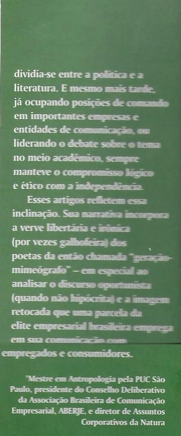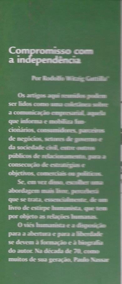 Em Tudo é Comunicação, o professor, consultor e jornalista Paulo Nassar mostra a importância de todos os elementos na construção da imagem – seja de um produto, de uma empresa ou de uma personalidade. Escrito em forma de pequenos artigos, o livro pode ser lido como um manual de sobrevivência da comunicação entre os consumidores e as marcas, os políticos e os eleitores ou nos relacionamentos profissionais. Pequenos detalhes podem comprometer toda uma campanha de mídia. A partir de exemplos retirados do cotidiano, Nassar discute questões ligadas à comunicação empresarial brasileira, em que a ética e a responsabilidade social são cada vez mais cobradas pelos consumidores. Porque Tudo é Comunicação.